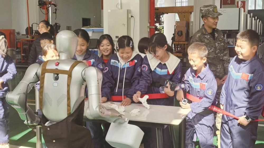图为汇博具身机器人正和参加研学活动的同学们进行清理桌面垃圾的互动。 冯琳琳 摄