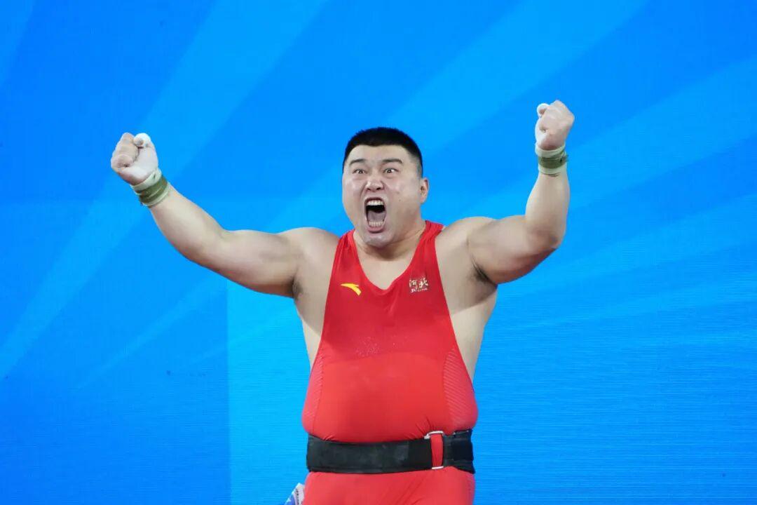 张喜亮在举重男子109公斤以上级决赛中激情庆祝。新华社记者 杨晨光 摄