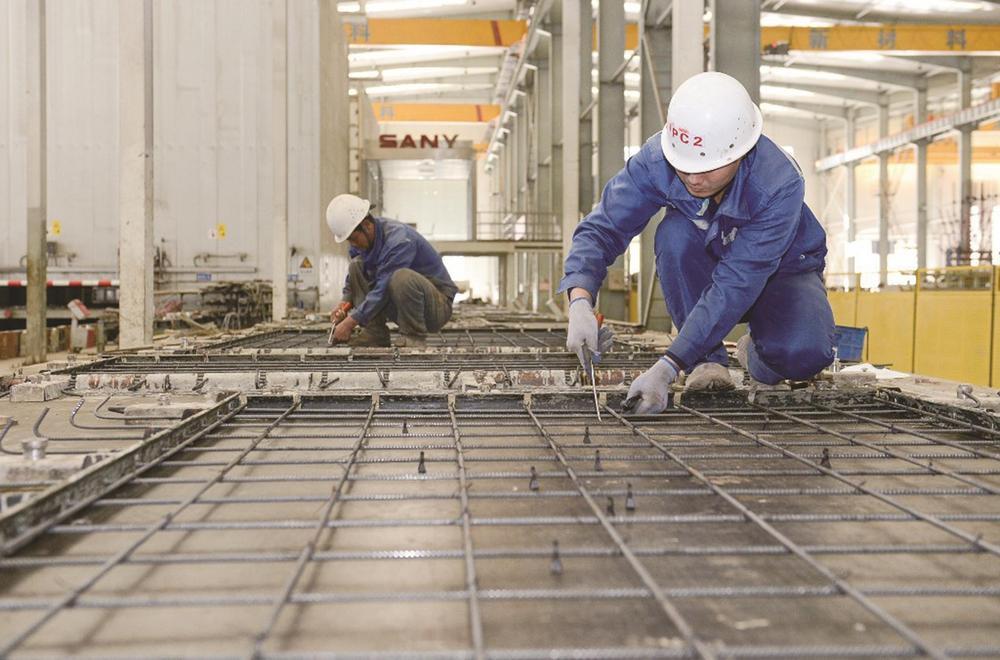 图为津西叠合板产线上工人正在绑筋工位进行作业。杜雯拓 摄