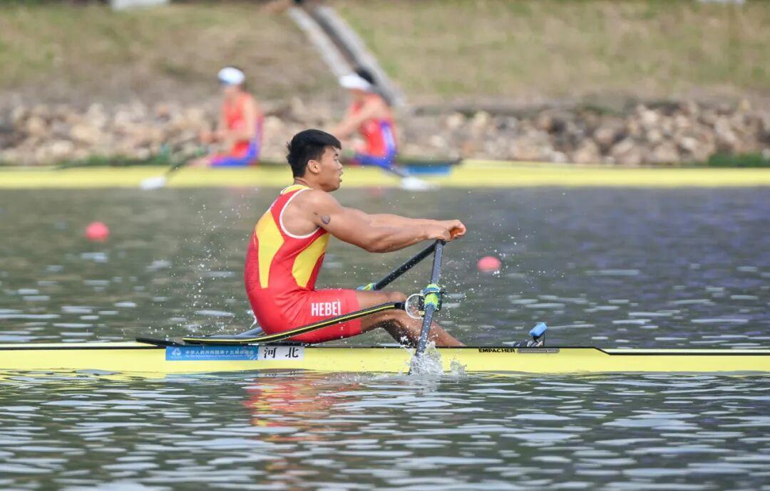 韩崴在赛艇男子单人双桨比赛中。新华社记者 肖恩楠 摄