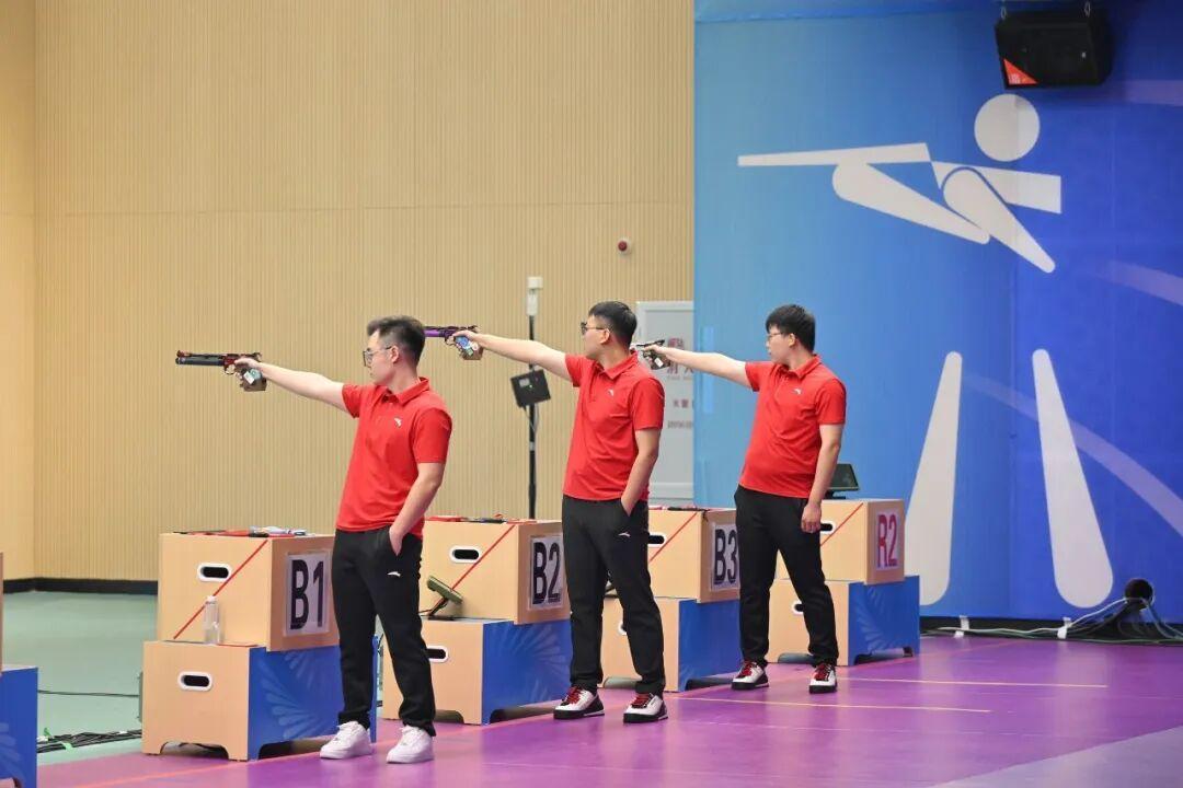 第十五届全运会射击男子10米气手枪团体决赛,胡鹏琦(中)在比赛中。新华社记者 丁磊 摄
