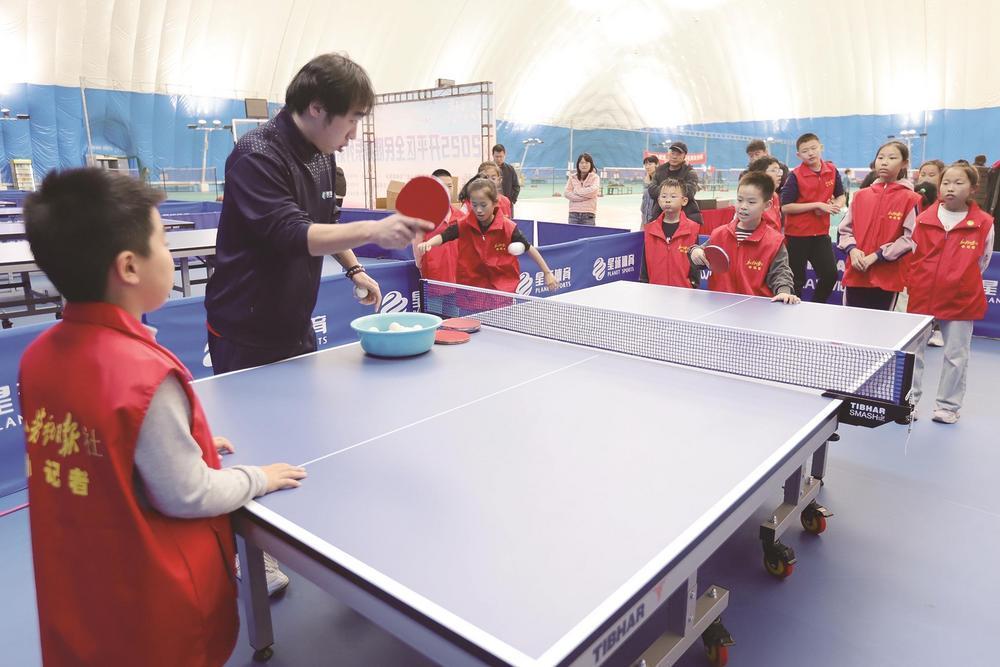 “握拍要稳,视线紧盯球体,发力要轻巧”,教练手把手纠正小记者们的握拍姿势与击球动作,讲解发球、接球的技巧要领。球台上发出“乒乒乓乓”的清脆声响。有的小记者精准接球,赢得阵阵喝彩;有时出现失误,就立刻调整状态,全力以赴完成每一次击球。“5个球打完,手心都出汗了,特别有成就感!”小记者兰天伊兴奋地说。