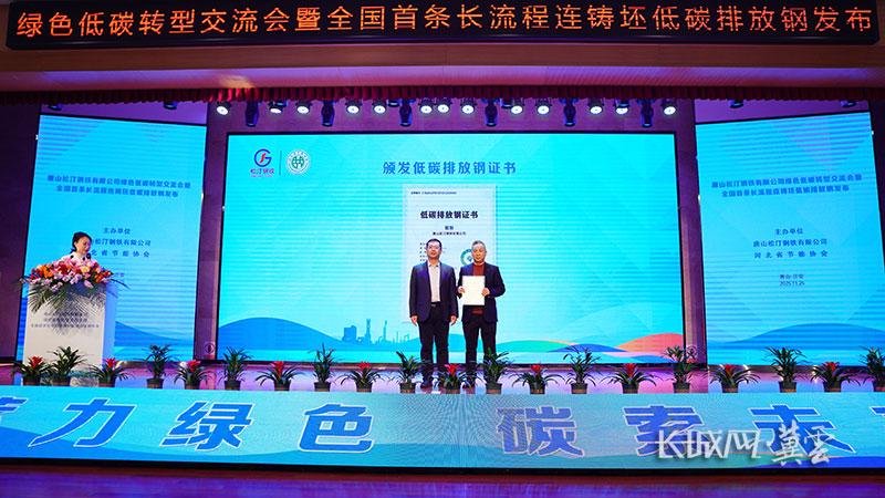 为松汀钢铁颁发“粗钢产线低碳排放钢认证证书”。长城网·冀云客户端记者 邢丁 摄