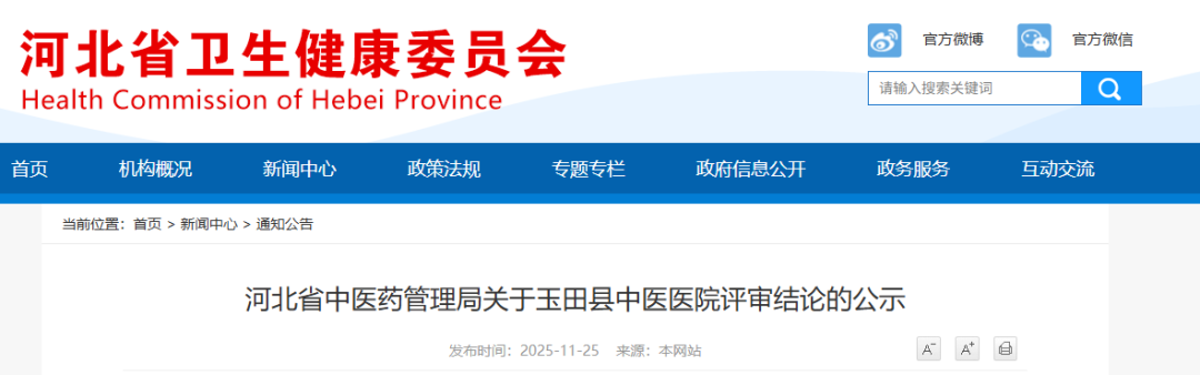 按照《中医医院评审暂行办法》等有关规定,省中医药管理局于2025年10月18日至19日,组织评审专家组,对玉田县中医医院开展了三级中医医院等级评审。根据专家组评审意见,经研究,认为医院达到了三级甲等中医医院标准。为接受社会监督,现将评审结论予以公示。公示期7天(2025年11月25日至12月1日)。