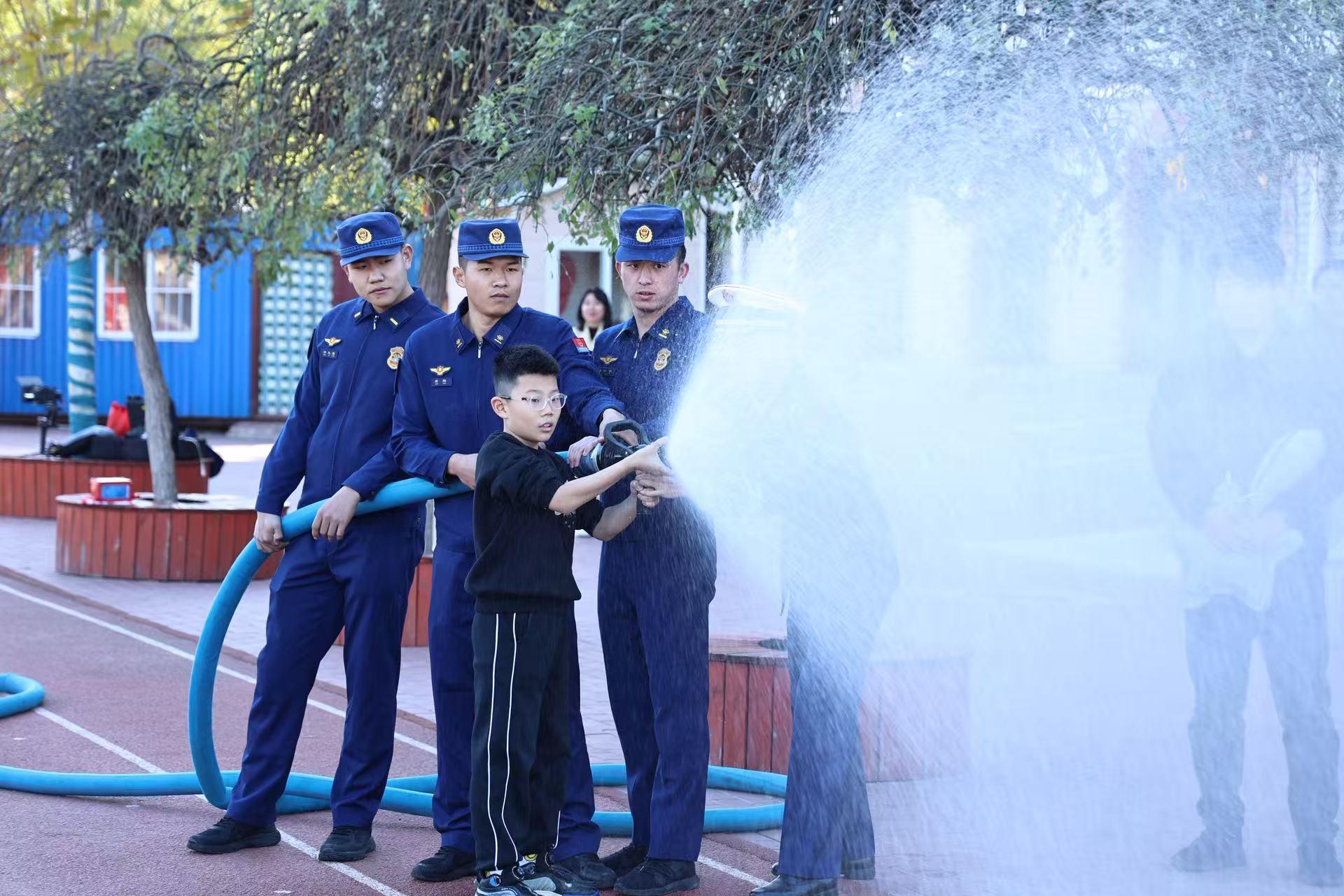 实地体验环节,消防员驾驶着消防车来到校园门口,架设好消防水带,高压水流瞬间喷涌而出,引来同学们的阵阵欢呼。随后,在消防员的指导下,同学们轮流体验了握水枪、开关水阀等操作,亲身感受消防装备的威力与使用方法。消防宣传员还耐心讲解了消防车的构造、各类消防器材的功能,让同学们近距离接触消防、了解消防。