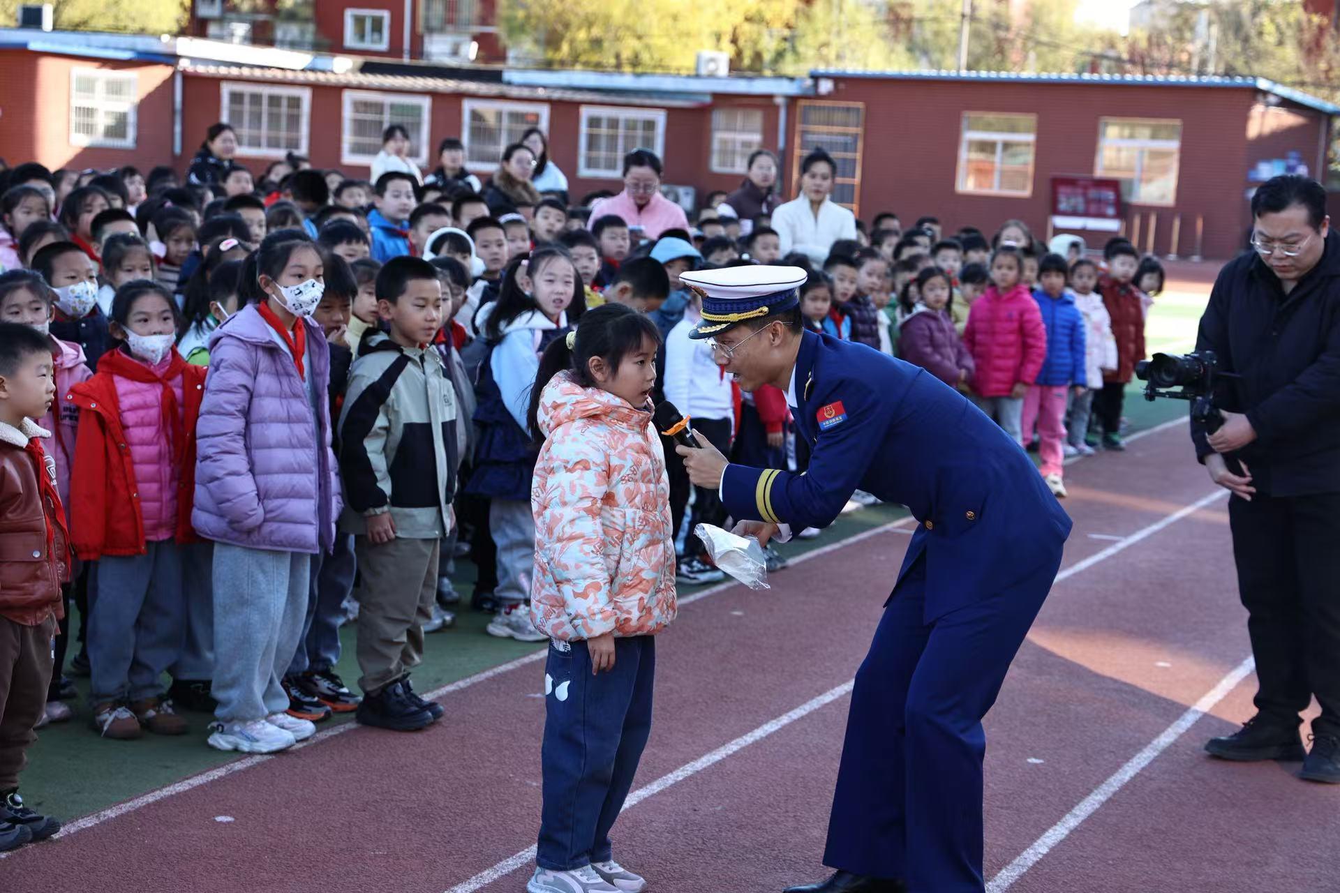 知识讲解环节,路北区消防救援大队的消防宣传员将复杂的消防常识编成朗朗上口的口诀,带着同学们逐句跟读、反复背诵。大家学得认真、记得牢固,短短几分钟就熟练掌握了核心要点。随后的抢答环节更是点燃全场热情,消防宣传员刚抛出问题,同学们便迫不及待地喊出答案,在轻松欢乐的氛围中把消防安全知识刻进心里。