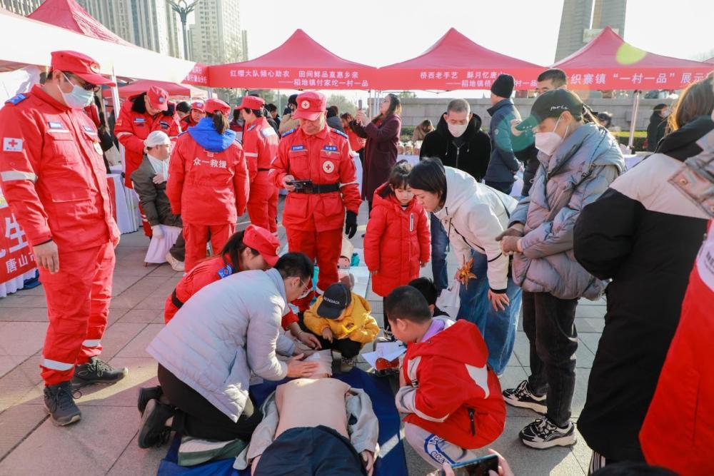 ↑12月6日,唐山市路南区红十字会志愿者在活动现场为居民讲解急救知识。(马佳明 摄)