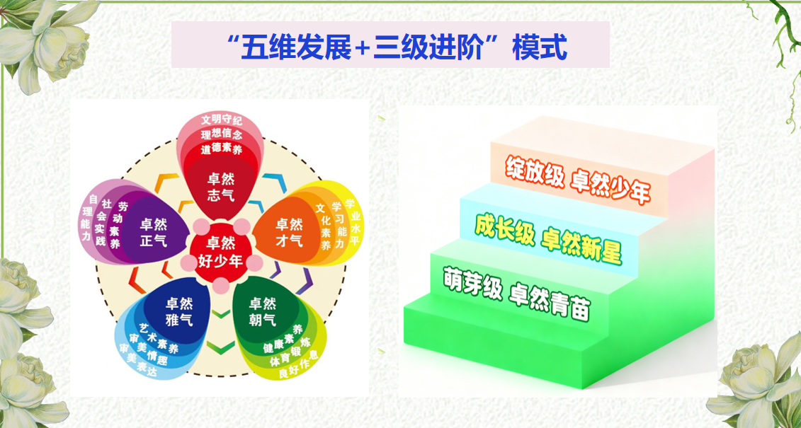 在“五维并举”体系与卓然手册的基础上,我们构建“五维发展+三级进阶”激励模式,让孩子的成长有目标、有路径、有成就感。