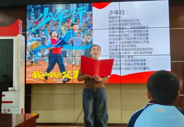 活动在充满未来感的《少年行》故事中拉开帷幕。影片中机器人“爸爸”与追梦少年之间关于失败、坚持与陪伴的温情故事,深深吸引了在场的每一位队员。观影前,大队辅导员精心设计的“导赏问题”引导队员们带着思考沉浸剧情;观影后,诸多电影金句,更成为队员们热议和感悟的焦点,让他们在感动中深刻理解了梦想的重量与坚持的价值。