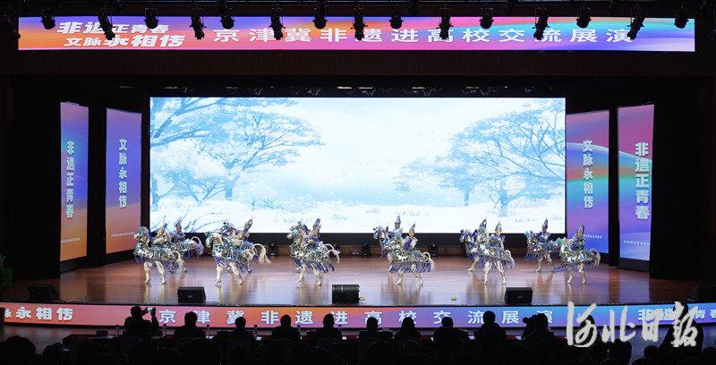 下午3时,曹妃甸职业技术学院活动中心,开场歌舞《协同向未来》瞬间点燃“非遗正青春 文脉永相传”京津冀非物质文化遗产交流展演活动激情。国家级非遗代表性项目唢呐艺术·唐山花吹《新百鸟朝凤》、相声《欢歌笑语》、歌曲《玉田泥人》、迁安地秧歌《逗秧歌》、京东大鼓《长寿村》《送女上大学》、河北梆子《大登殿》、沧县狮舞《雄狮耀中华》、北京延庆南关竹马《冰雪竹马》等轮番上场,精彩节目串联起三地非遗脉络,展示了京津冀非遗的绚烂之美,赢得阵阵喝彩。