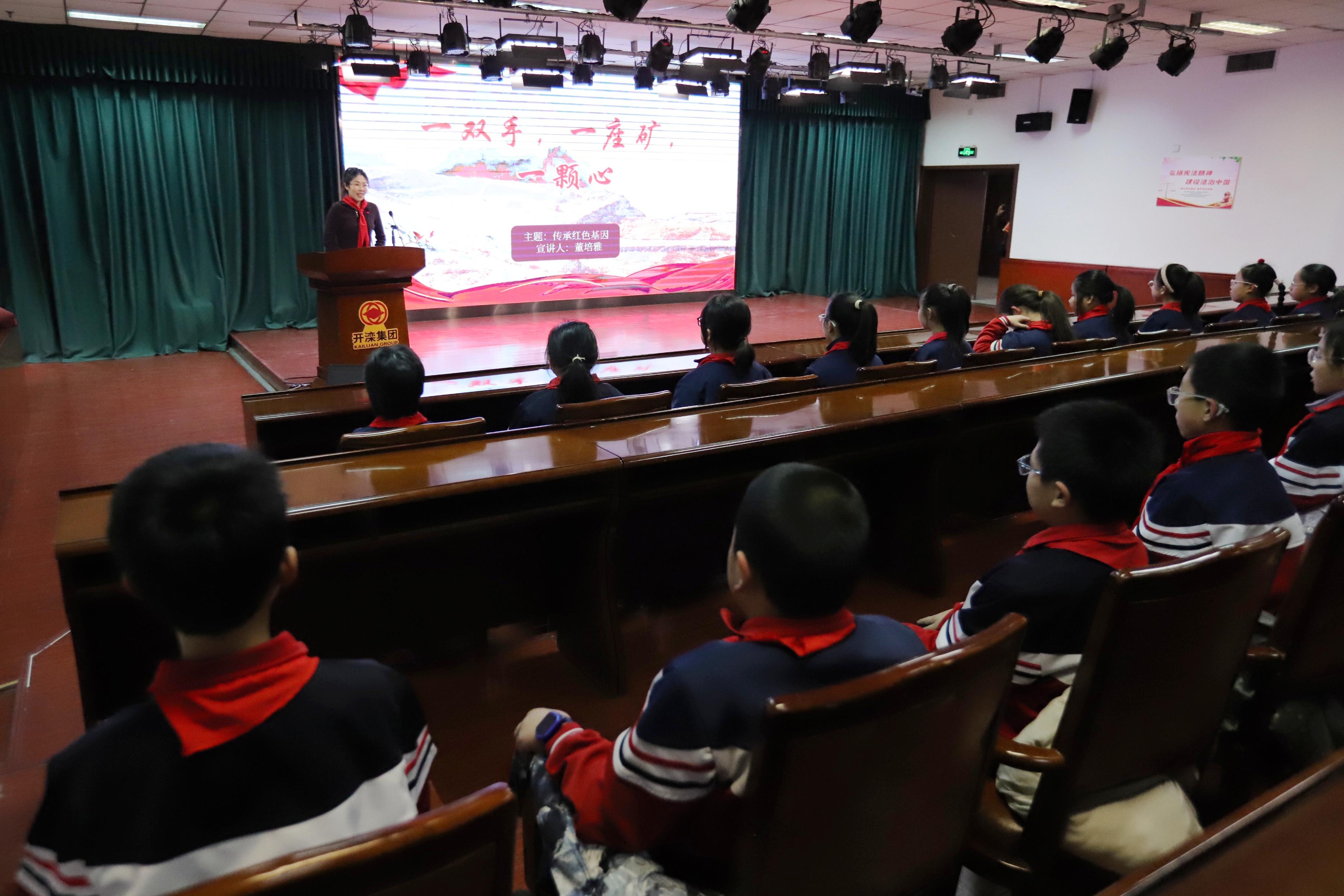活动在庄严热烈的氛围中拉开序幕。第七实验小学校外辅导员、开滦国家矿山公园宣教部讲解员董培雅老师以“一双手,一座矿,一颗心”为主线,为队员们带来一堂沉浸式的宣讲。屏幕上那双嵌着煤黑、布满硬茧的矿工之手,缓缓展开了跨越三个世纪的历史长卷:从旧社会“煤黑子”的悲苦境遇,到1938年开滦工人挥舞大刀抗日救亡的壮烈,从新中国成立后“多出煤、出好煤”支援国家建设的豪迈,到震后废墟中托起“抗震志气煤”的坚韧,再到新时代矿山转型发展的奋进篇章。一双双手串联起开滦的百年沧桑,生动诠释了毛泽东同志赞誉开滦工人阶级“特别能战斗”的红色精神内核,鲜活的故事深深打动了在场每一位队员。