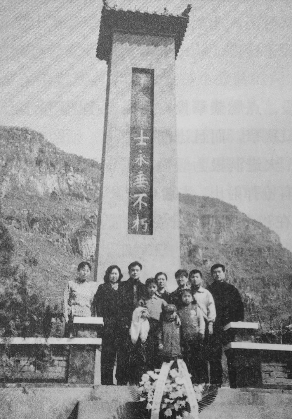 (黄昏峪百姓为傅惠轩等烈士树立的纪念碑及来此祭奠的烈士后代)