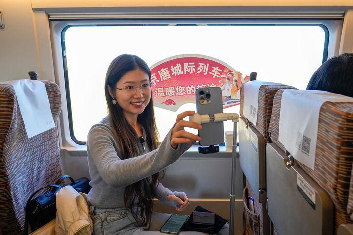12月30日,旅客在列车上留影。(赵亮 摄)
