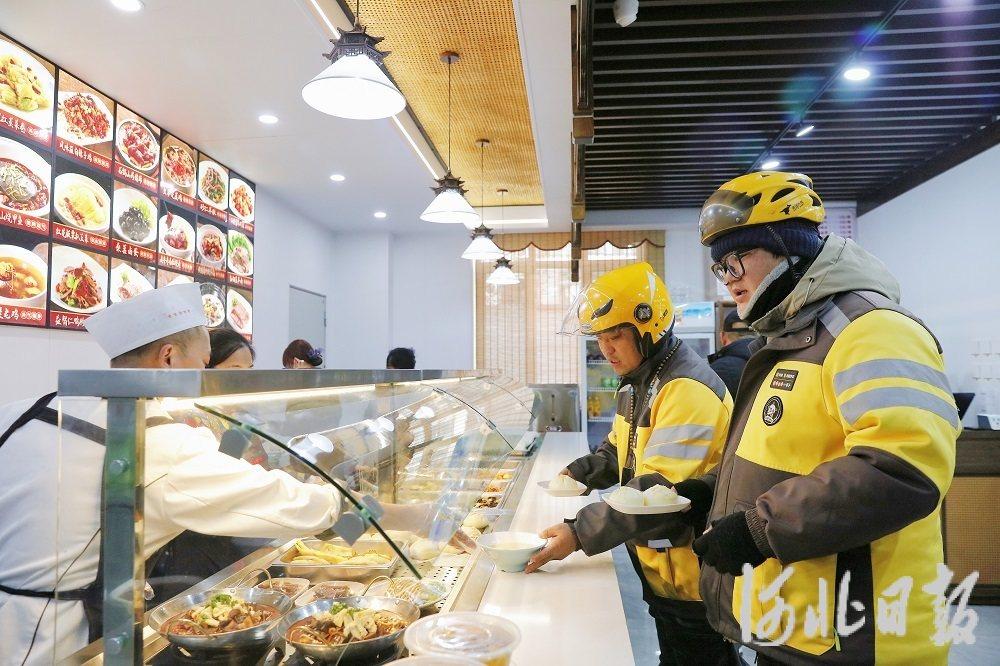 1月9日,在唐山玉田县无终街道昌盛社区居民服务中心的暖新食堂,外卖小哥们正在点餐。河北日报记者 师源 摄