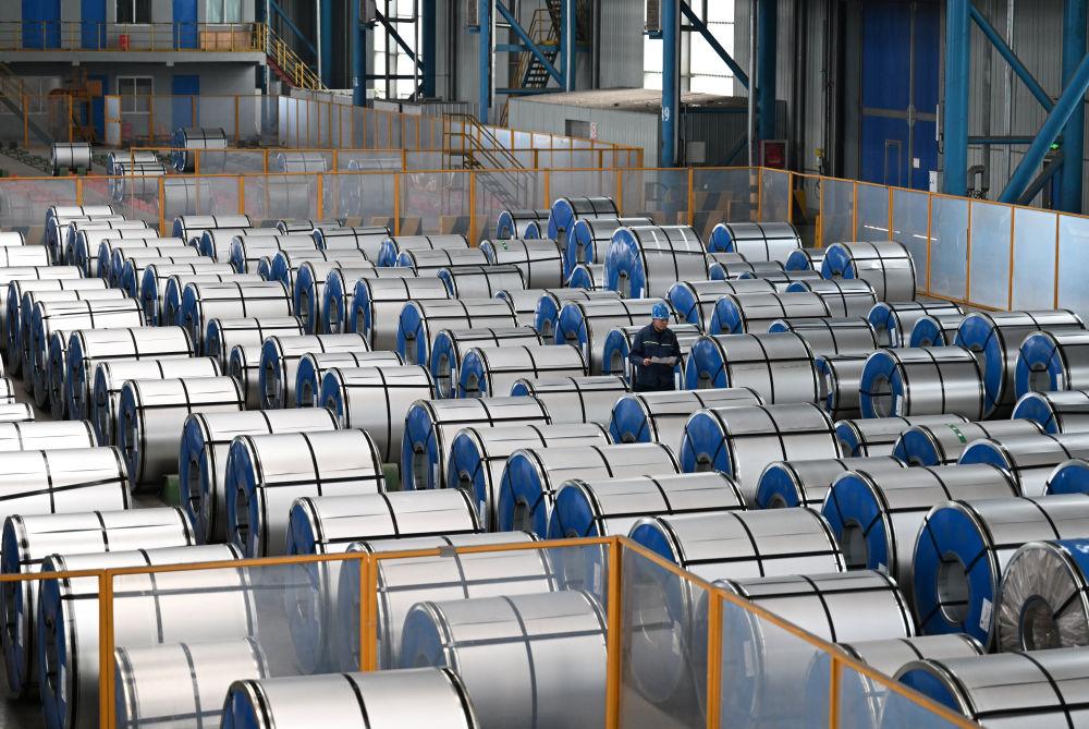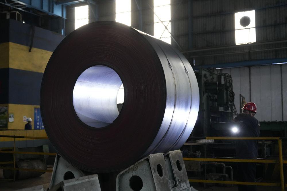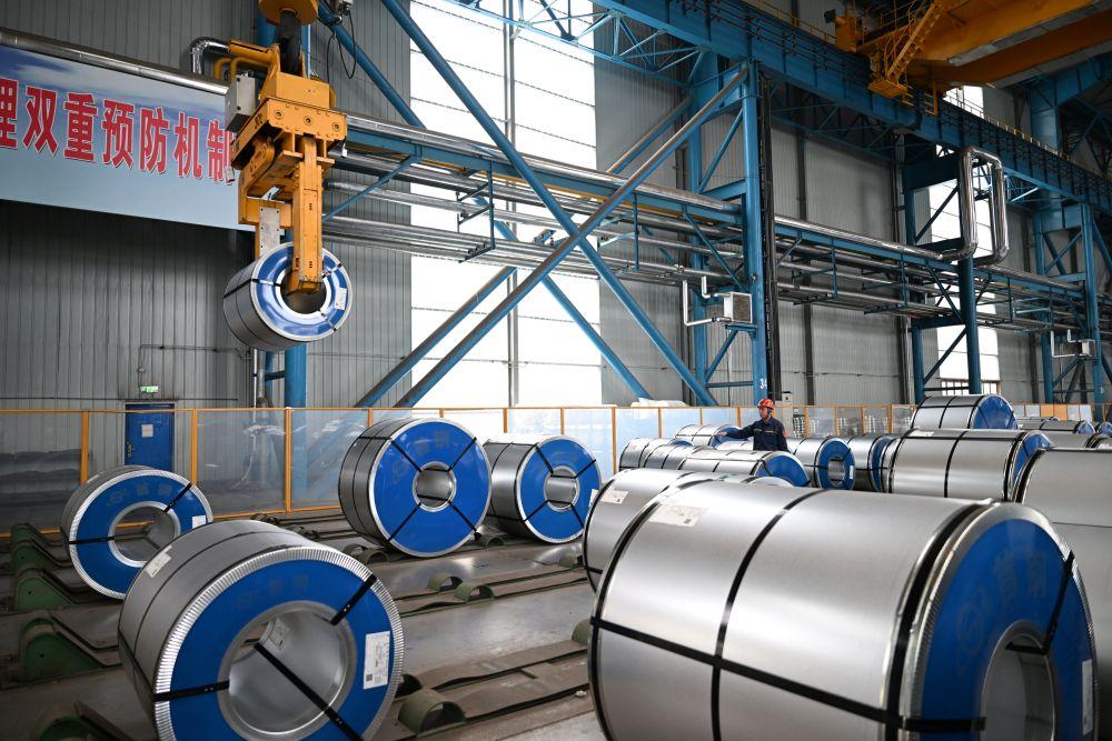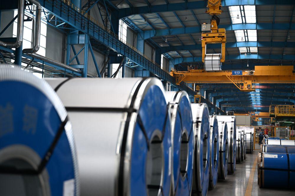 ↑1月14日,首钢智新电磁材料(迁安)股份有限公司工作人员在电工钢成品区巡检。