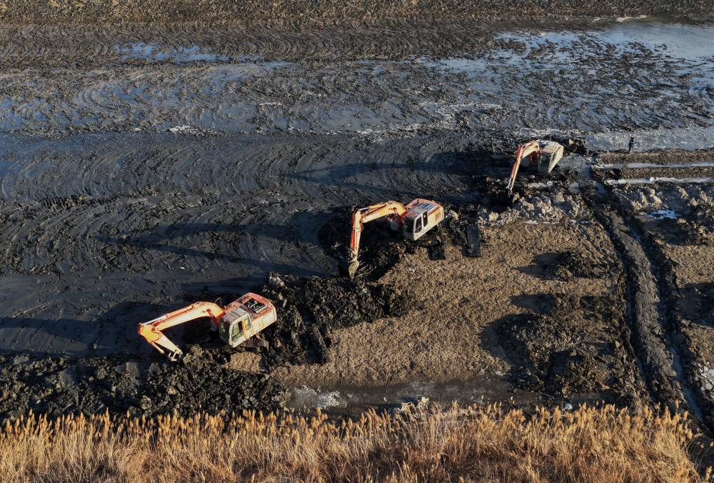 ↑1月13日,挖掘机在河北省唐山市丰南区境内的陡河清理河道淤泥(无人机照片)。