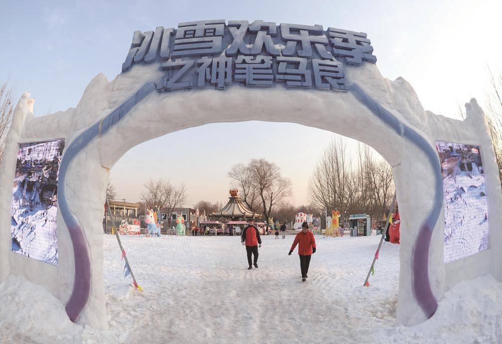 唐山皮影主题乐园冰雪欢乐季启幕,游客步入以“神笔马良”为寓意的冰雪拱门,开启冬日冰雪畅玩之旅。