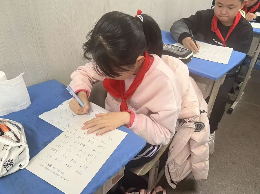 在语文百字竞赛现场,同学们全神贯注,横竖撇捺间尽显书写功底。赛场气氛紧张而有序,大家凝神聚力,力争呈现最优质的答卷。一张张整洁的卷面、一个个匀称的汉字,不仅展现出学生们扎实的书写能力,更镌刻着日常勤学苦练的努力印记。