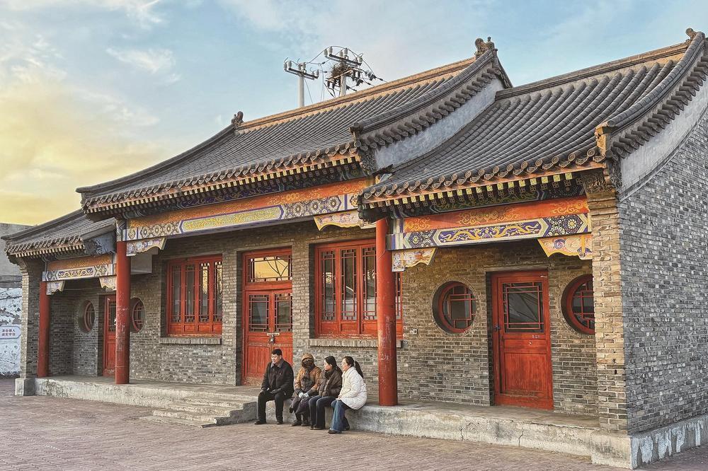 轩坡子村民坐在新家庙的台阶上,享受闲暇时光。 张泽慧 摄