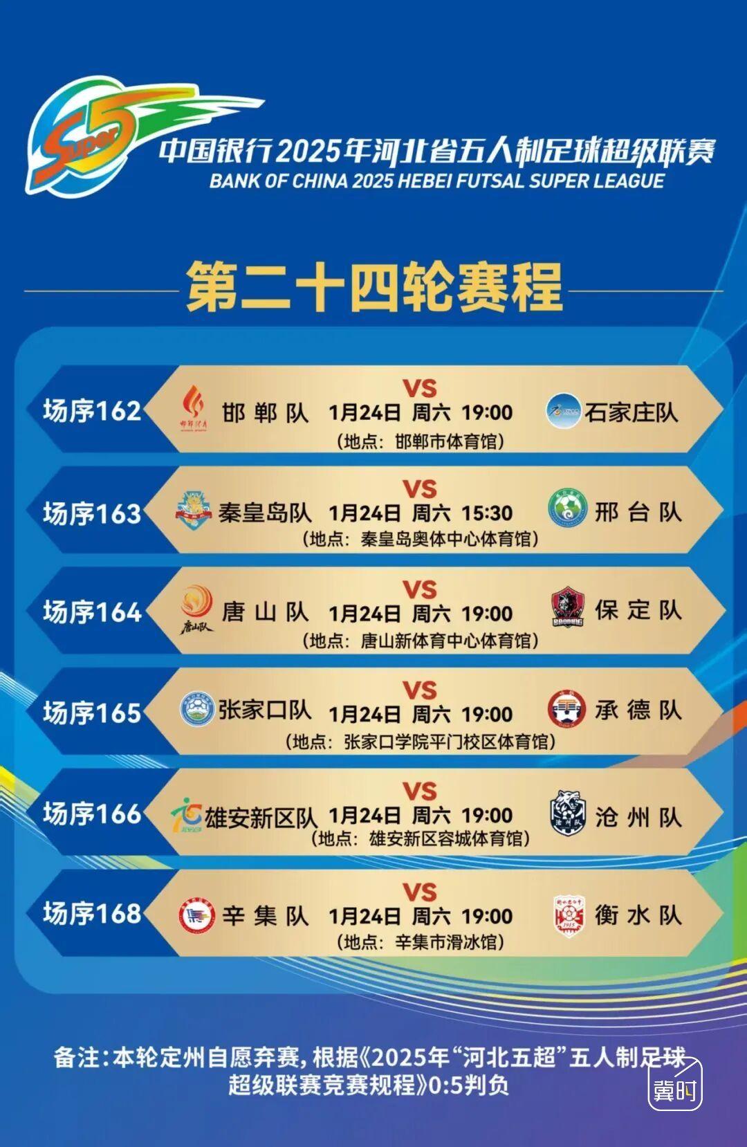 冀时新闻报道(河北台 魏海超)1月24日(周六),“河北五超”将迎来第24轮的角逐。届时,六大赛区将同时拉开战幕,12支球队再度集结,为联赛排名展开新一轮的激烈争夺。