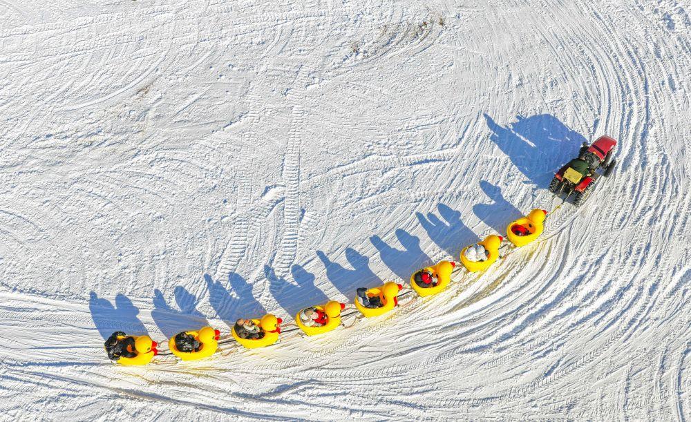 ↑1月23日,游客在凤凰山景区冰雪乐园乘坐雪圈滑雪(无人机照片)。