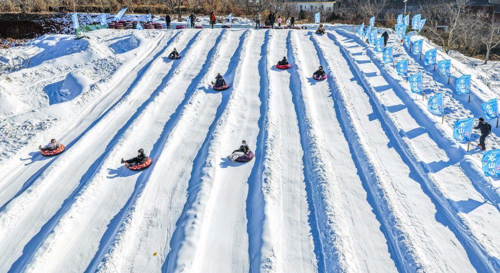 寒冬时节,河北省唐山市迁西县凤凰山景区冰雪乐园迎来众多游客,人们在这里滑雪游玩,乐享冬日时光。