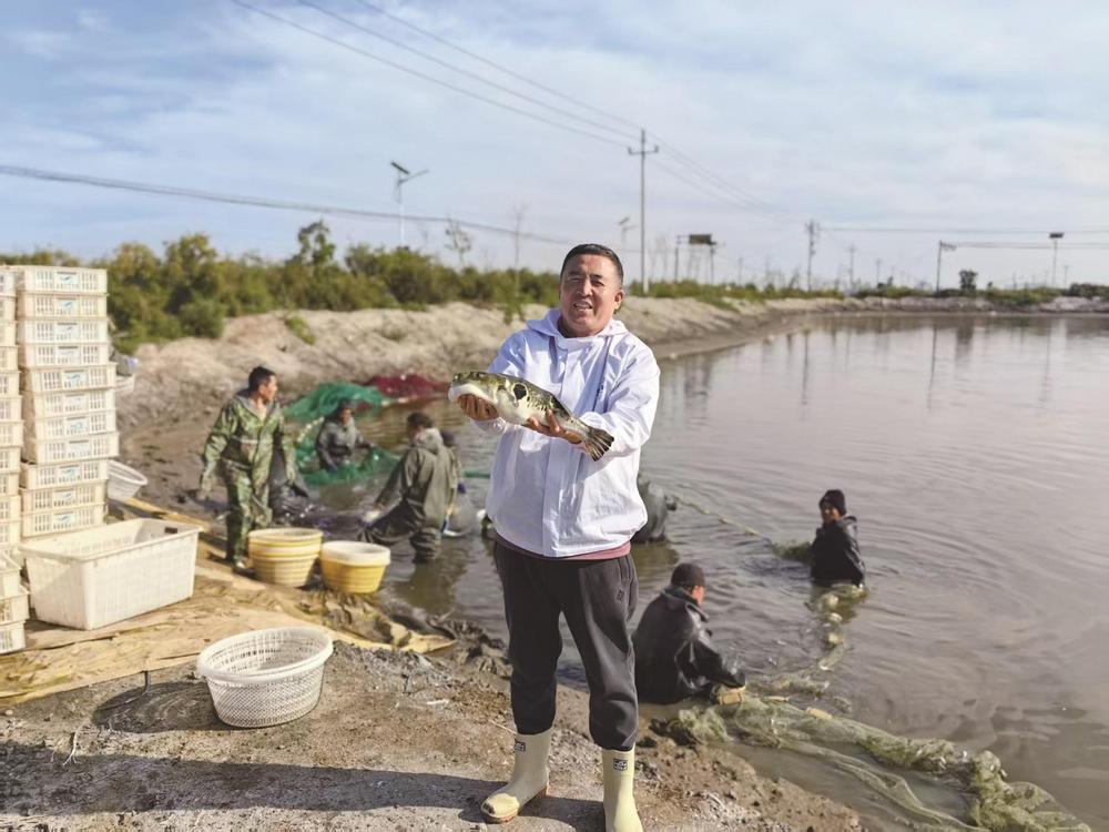 图为“鲜知道”河豚养殖合作社负责人周玉杰手捧一条刚打捞上来的河豚。(资料图)记者 景立华 摄