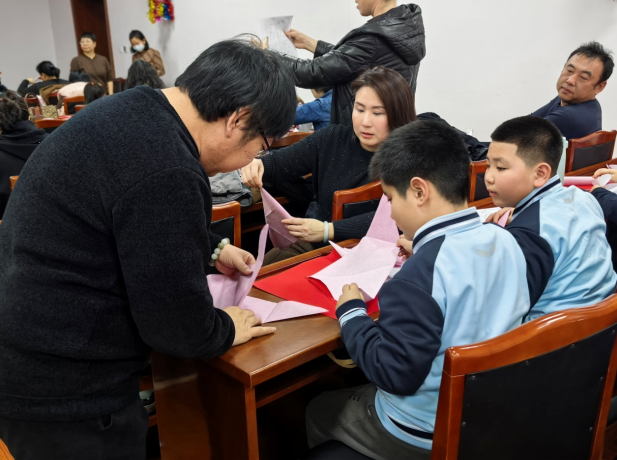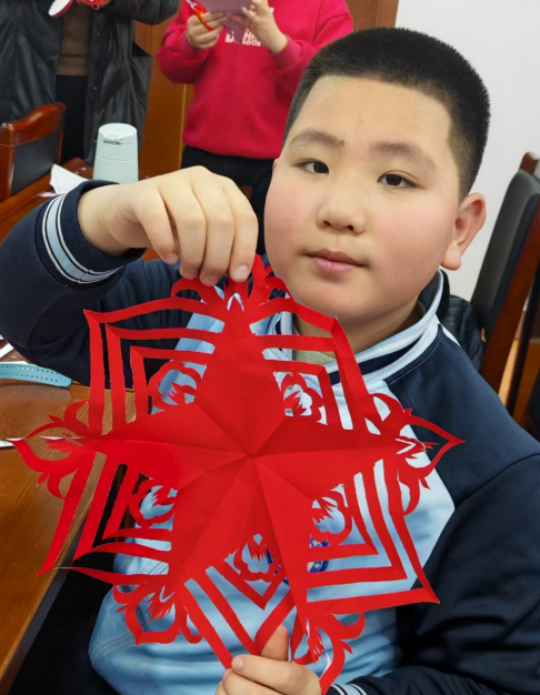 此次活动将美育实践与乡土文化教育相结合。在活动现场,孩子们围坐桌前,目光专注地跟随艾老师的示范。从安全使用剪刀到纸张折叠、剪纸技法……艾老师耐心讲解、手把手指导,带领孩子们一步步完成简易的剪纸团花和福字作品。