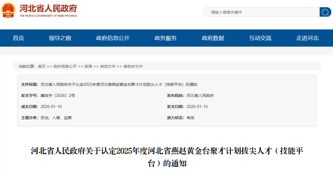 河北省人民政府发布关于认定2025年度河北省燕赵黄金台聚才计划拔尖人才(技能平台)的通知,决定认定于冬等100名同志为河北省燕赵黄金台聚才计划拔尖人才(技能平台)。自认定次月起,按照有关规定享受省政府工作津贴和其他相关待遇。