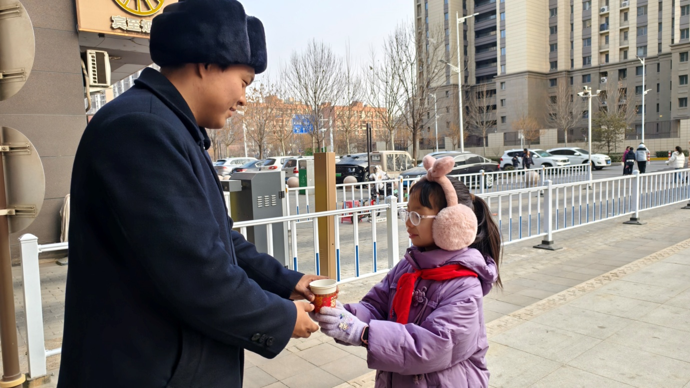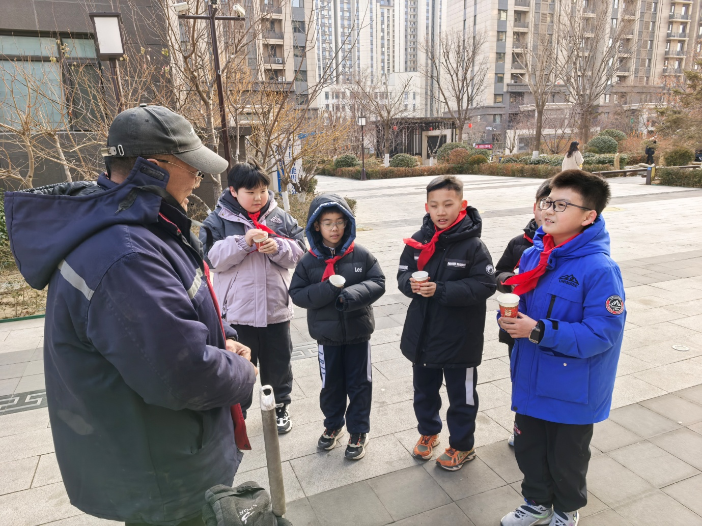 抵达大城府小区后,少先队员们分成小组,穿梭在小区的街巷与门岗之间。“环卫阿姨,您每天辛苦打扫,让我们的社区干干净净,这杯姜汤送给您暖暖身子!”“保安叔叔,感谢您日夜守护小区的安全,祝您平安健康!”队员们稚嫩的声音带着真诚的问候,将温热的红糖姜汤递到环卫工人和保安叔叔手中。接过饱含心意的姜汤,叔叔阿姨们脸上洋溢着欣慰的笑容,喝下一口,暖意从舌尖蔓延至心底。环卫工王阿姨感动地说:“这么冷的天,队员们特意送来姜汤,心里太暖了,感觉再辛苦也值得!”