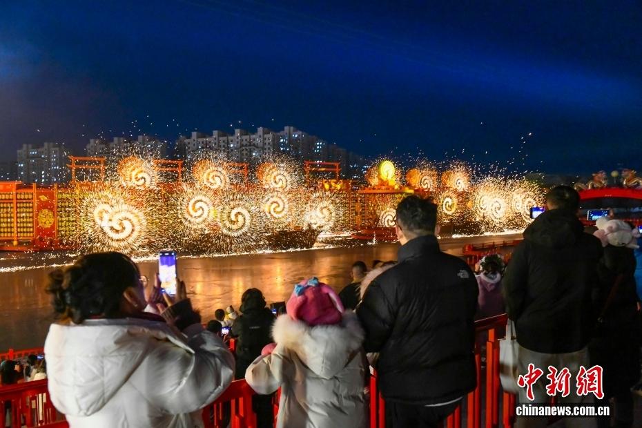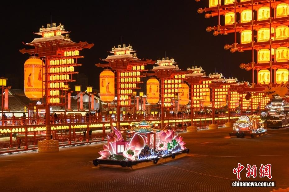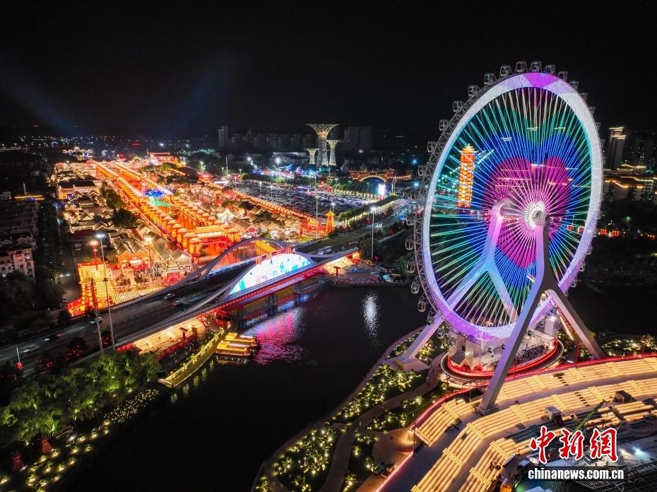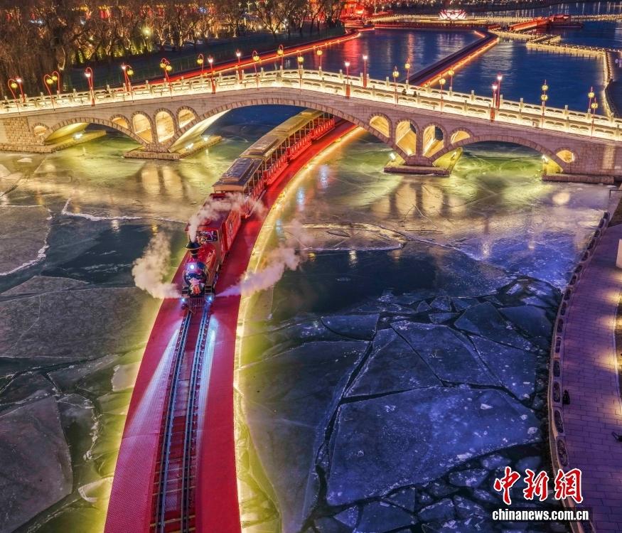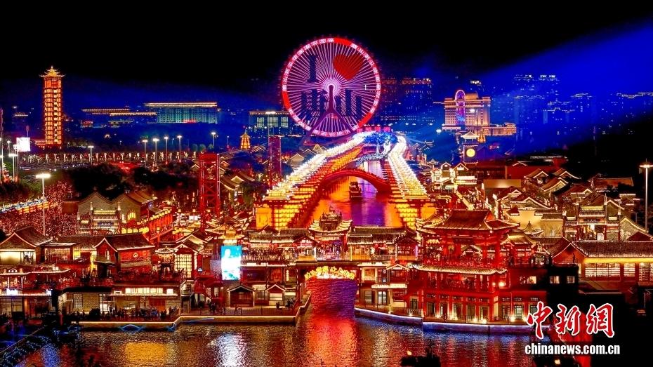 唐山城市新地标——“唐山之光”摩天轮、唐山宴、飞越河北影院……河头老街,这条有着百年历史的老街如今吸引着来自全国各地的游客,赏美景、品美食,俨然已成为“水上大唐不夜城”。图为河头老街景区灯光璀璨、美景如画。