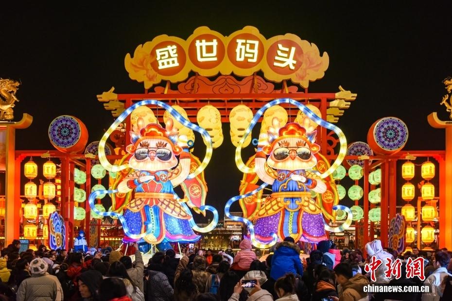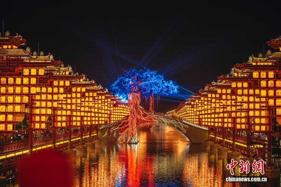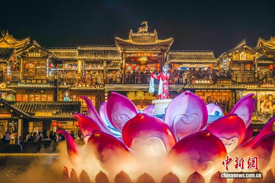 河头老街景区灯火辉煌、游客络绎不绝,到处是一派喜庆洋洋的节日氛围。