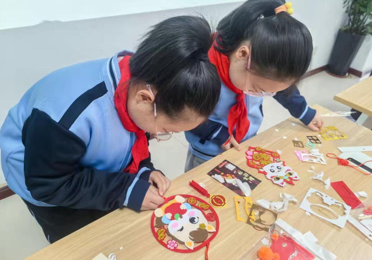 同学们亲手制作的纸艺灯笼,以对称美学诠释“照亮前程、阖家团圆”的美好寓意;用彩纸拼接的“永不融化”糖葫芦,还原非遗美食的喜庆造型,体会“团圆串起幸福”的文化内涵;点缀亮片与流苏的福字挂件,将祈福纳祥的传统习俗融入指尖创作。这些带着体温的手作作品,不仅是装点家居的新春饰品,更让孩子们在实践中读懂了传统年俗的文化密码,让年味在创作中愈发醇厚。
