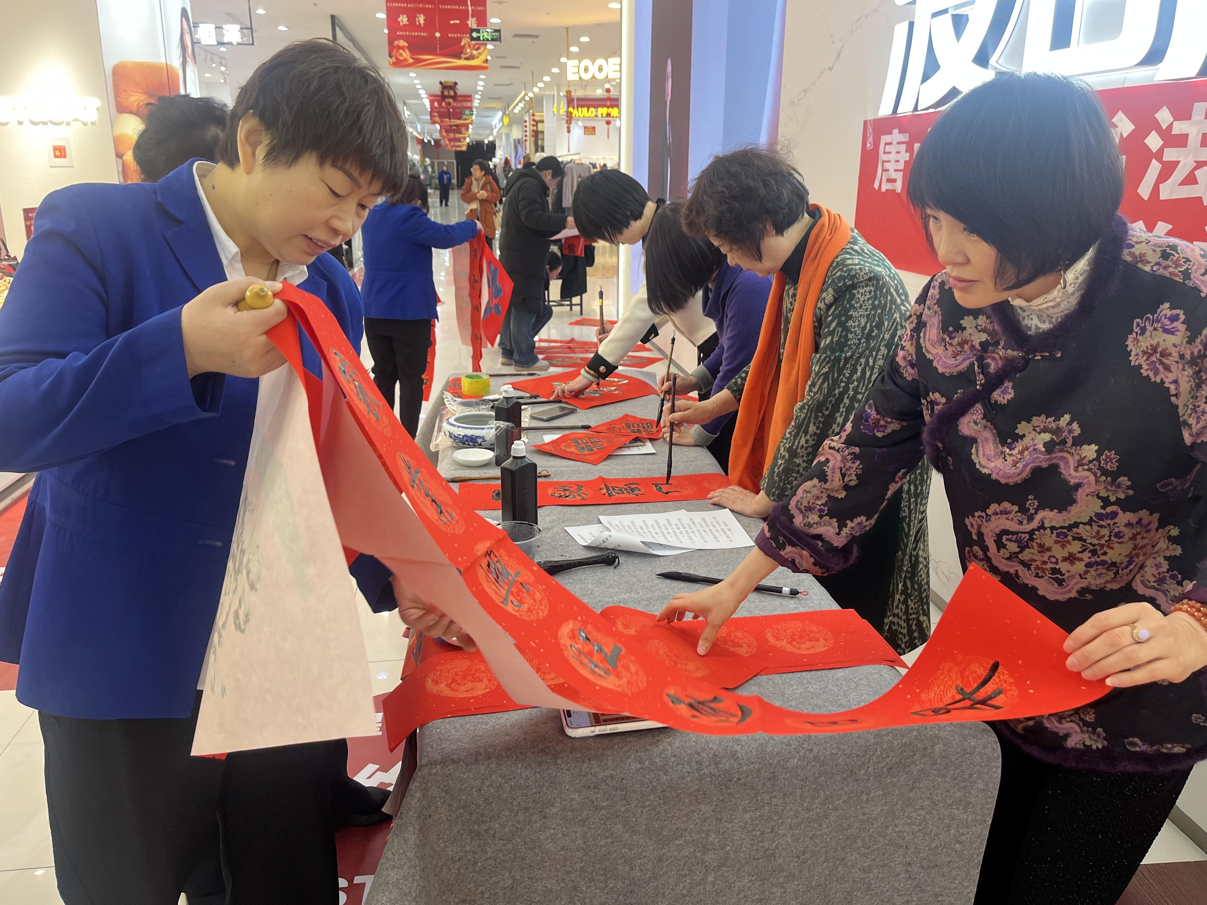 2月7日上午,唐山市女书法家协会举行了一场热热闹闹的“新春送福”活动。在人流如织的八方购物广场,张焕国、周静、贾宝芳、张乐然、王蕊等几位女书法家挥毫泼墨,现场书写对联、福字百余件,全部送给围观百姓,为凤凰城增添了年节的喜庆氛围。(宝芳/文 曹楠/摄)