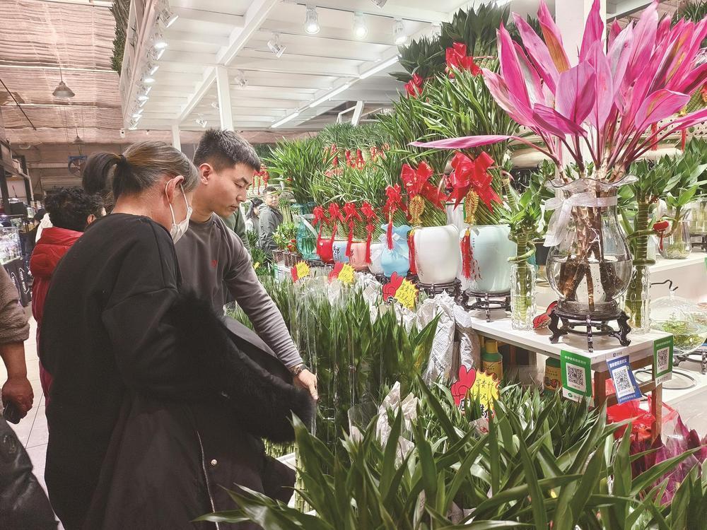 2月13日下午,记者在凤凰花卉市场花卉大厅内看到,各式年宵花被摆放在显眼位置,吸引着往来顾客的目光。商家一边熟练地修剪枝叶、整理包装,一边热情地为市民介绍不同花卉的品种特点与养护方法。现场人流不断,有人驻足欣赏,有人仔细询价,各自挑选着心仪的花束盆栽,呈现出一片繁忙而喜庆的购销景象。记者看到,许多顾客在选择花卉时,非常中意那些象征着喜庆和吉祥的品种,如红掌、富贵竹、蝴蝶兰、发财树、吉祥果、金橘等。“快过年了,家里摆上几盆鲜花,一下子就有节日气氛了。”市民周女士说,自己每年春节前都会来挑一些鲜花和绿植放在客厅里,又好看又喜庆。