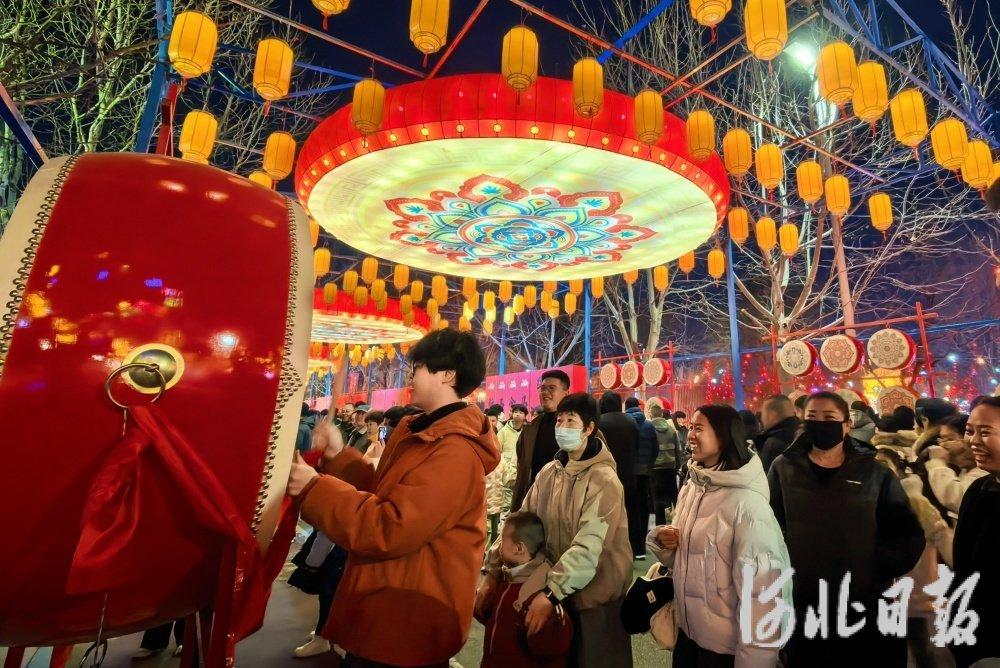 2月17日晚,游客在唐山南湖春节灯会体验敲鼓乐趣。河北日报记者王育民摄