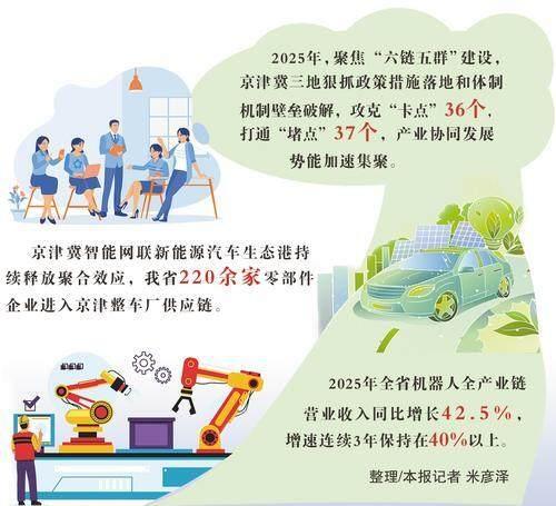 “六链五群”的协同实践,划出京津冀区域经济高质量发展的上扬线。2025年,京津冀三地规模以上工业增加值分别比上年增长6.5%、4.2%和7.9%。其中,北京、河北工业战略性新兴产业增加值分别增长15.5%和11.0%。(河北日报记者 米彦泽)