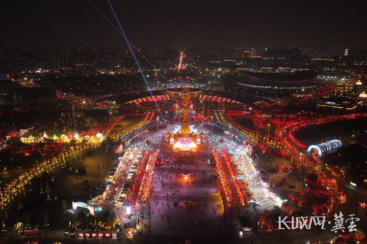 夜幕低垂,唐山南湖·开滦旅游景区丹凤朝阳广场上,高达十余米的主灯组“以梦为马”流光溢彩,仿佛踏浪奔腾。