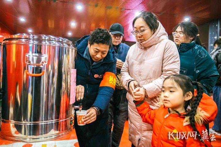 景区志愿者正在为刚入园的游客接热气腾腾的姜茶,送上贴心问候。