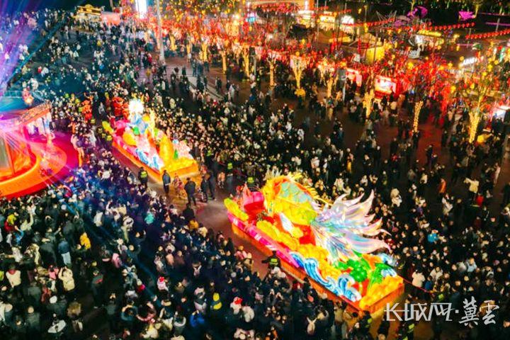 不远处的相亲大会现场,年轻男女在浪漫灯组前交换联系方式;美食市集里,各地特色小吃香气四溢,游客们手捧热食边逛边吃;麒麟彩车、鳌鱼彩车组成的巡游队伍缓缓前行,演员沿途抛洒祝福,孩子们追着彩车奔跑嬉戏。