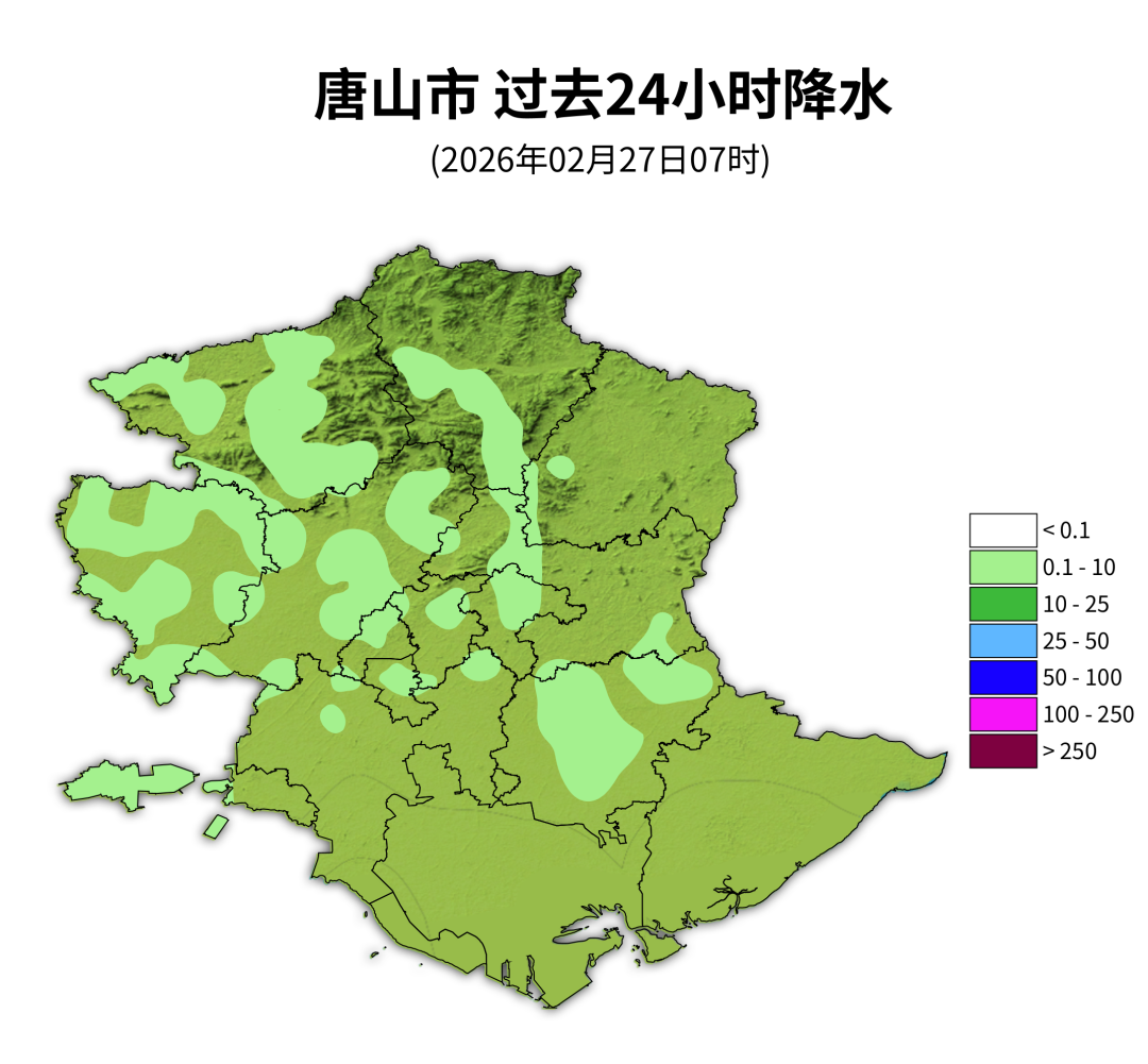 各县区平均降水量(单位:毫米):市区0.3;丰南0.2;丰润0.7;玉田0.7;迁西0.5;迁安0.2;遵化1.4;滦州0.4;滦南0.1;乐亭0;曹妃甸0。