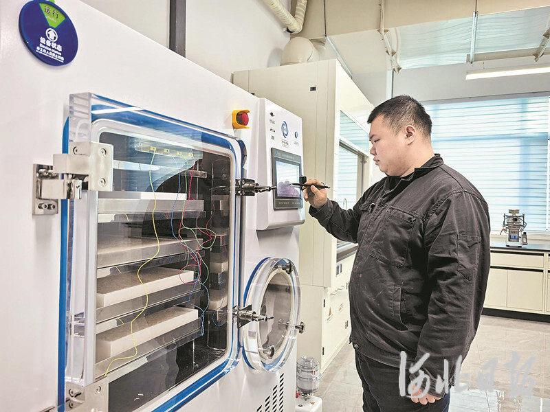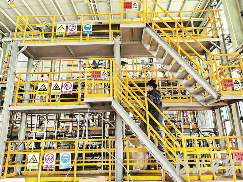 在开滦化工新材料中试及产业化示范基地,聚磷腈试验项目工作人员正在检查设备运行情况。
