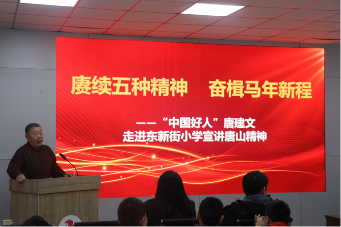 活动现场还特别邀请了“中国好人”唐建文。他结合自身经历,深情讲述唐山故事,并与其外孙李博森一同带来了一段铿锵有力的快板表演。他们用朴实而坚定的语言,将“唐山五种精神”的深刻内涵娓娓道来,赢得了在场师生的阵阵掌声。