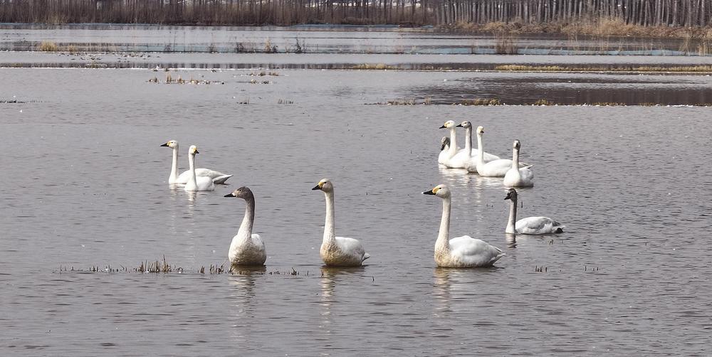 站在田埂远眺,成群的天鹅或在水面优雅游弋,激起细碎波纹;或俯身扎入水中觅食;或振翅齐飞,洁白的羽翼在晴空下划出优美弧线,成为当地一道美丽风景线。