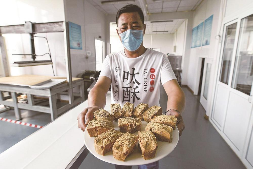 在制糖车间里,熬糖、拉糖、压糖、拧花……一道道纯手工工序有条不紊地进行着。制糖师傅紧盯着糖锅里的糖稀,不时用测温设备测量温度,火候差一分,口感便谬以千里。熬好的糖稀晾凉后,与金黄的花生碎充分混合,再用木杠反复碾压,最后切成小块、拧出精致的花纹,一块香甜酥脆的花生酥糖才算大功告成。“酥糖的配方比例、熬糖火候,我们研究了挺长时间,既要保证甜度和酥度,还得让它成型不散。”高启龙如是说。