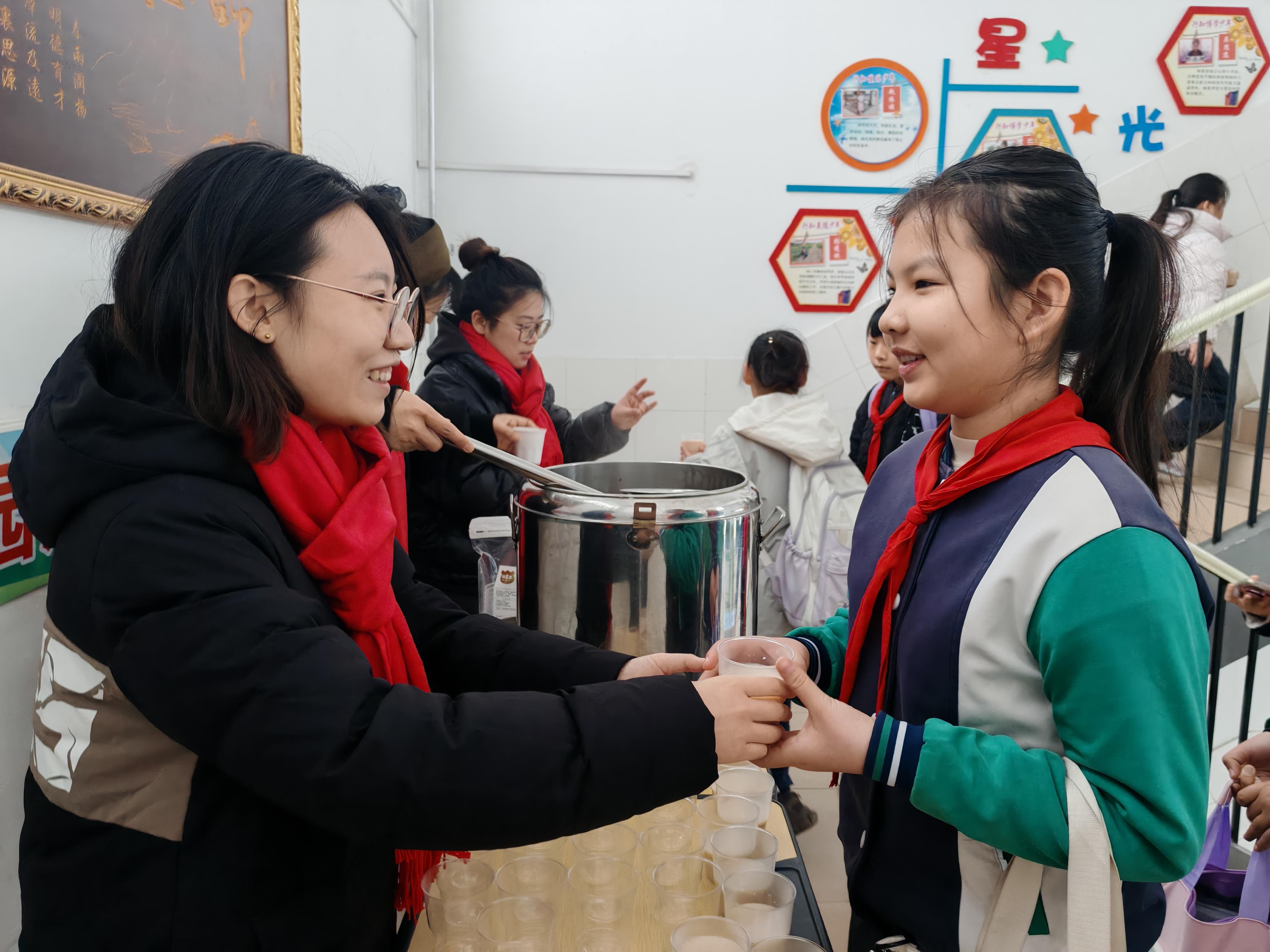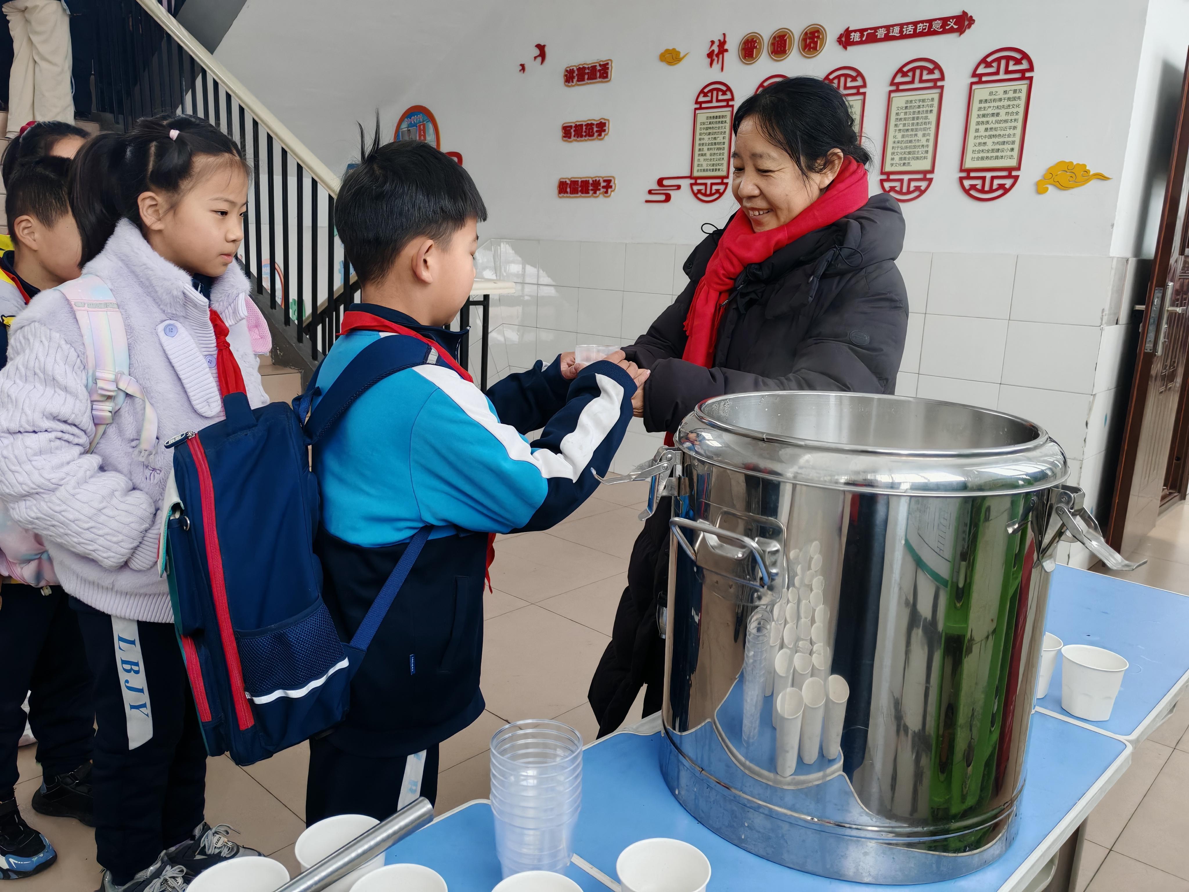 同学们来到学校,开心地从老师手中接过一杯杯热气腾腾的养生奶茶,指尖传来阵阵暖意,脸上洋溢着幸福与喜悦。这款奶茶以茉莉花茶为底,搭配牛奶、雪梨、山药、红枣、桂圆、枸杞慢煮而成,清甜不腻、温润养脾胃,能驱散春困、唤醒活力。新学期就在甜蜜、温暖中开始了。