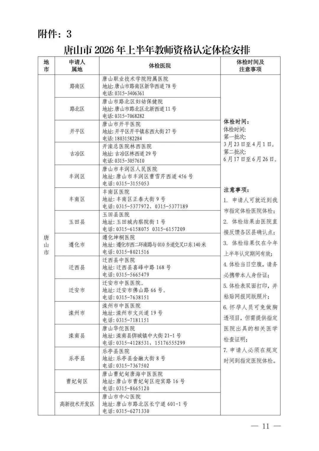 3.唐山市2026年上半年教师资格认定体检安排