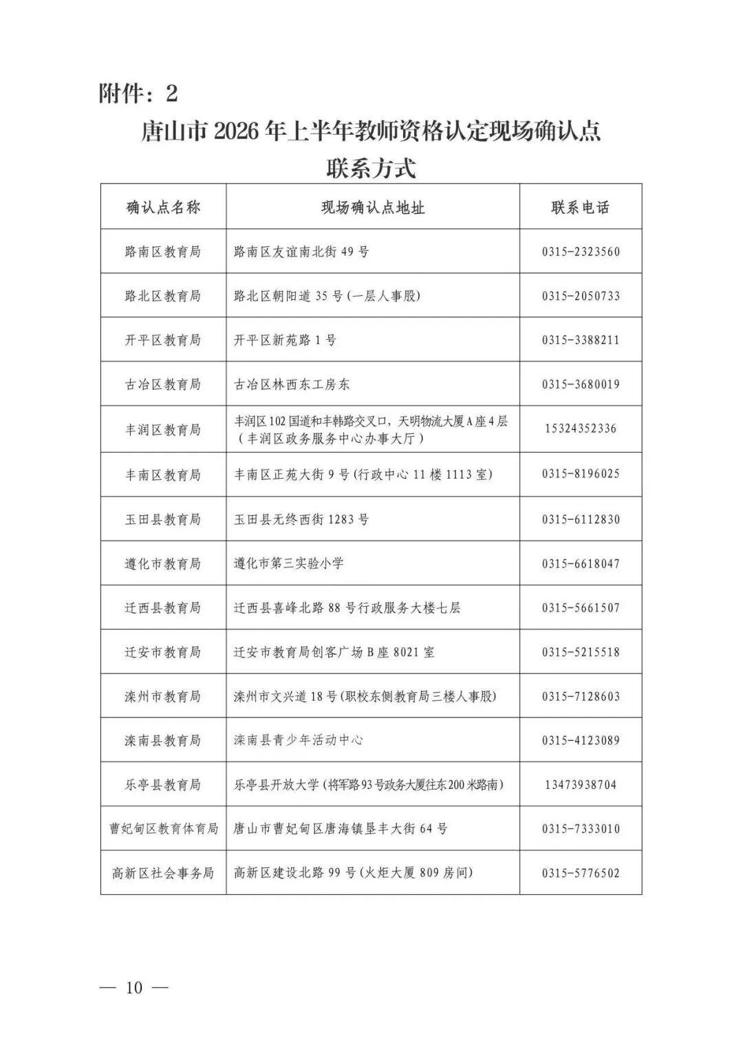 2.唐山市2026年上半年教师资格认定现场确认点联系方式