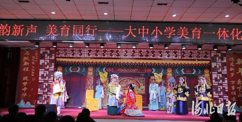 在美育浸润方面,唐山市将中华优秀传统文化、唐山本地优秀文化融入美育教学,常态化开展班级合唱、校园艺术节、非遗进校园等活动,为学生参与艺术实践提供资源支撑与展示舞台。同时,联合唐山师范学院评剧文化研究中心,开展“评韵新声 美育同行”——评剧演出进校园活动,依托校园艺术节、艺术展演等平台打造“行走的美育课堂”。通过剧目展演、成果展示和实践体验,让学生在艺术审美中涵养家国情怀,在文化实践中传承人文素养,推动美育从“课堂”走向“生活”、从“欣赏”走向“参与”。