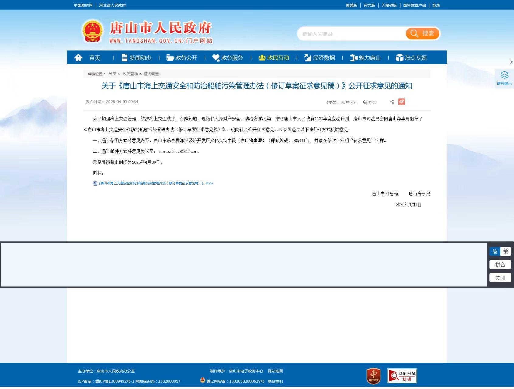 为了加强海上交通管理,维护海上交通秩序,保障船舶、设施和人身财产安全,防治海域污染,按照唐山市人民政府2026年度立法计划,唐山市司法局会同唐山海事局起草了《唐山市海上交通安全和防治船舶污染管理办法(修订草案征求意见稿)》,现向社会公开征求意见,公众可通过以下途径和方式反馈意见: